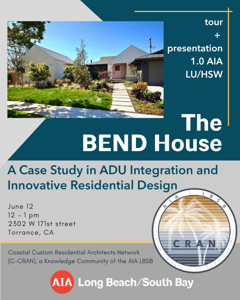 Join us for a guided tour and discussion at The Bend House, a newly completed residential project in Torrance that features a fully reimagined main home and a newly constructed ADU (Accessory Dwelling Unit) situated in the front yard – novel and intentional design decision. Located on a corner lot, this project creatively explores the relationship between site conditions and architectural expression, with playful nods to the concept of “bending” through the use of half arches and curved forms inside and out.